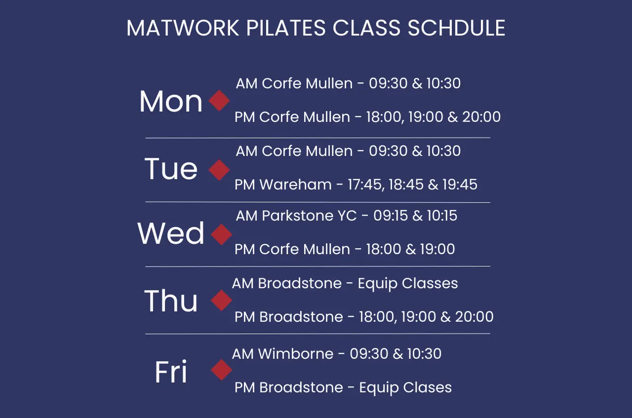 We offer matwork Pilates classes in Broadstone at a variety of different times and day. Currently, our Broadstone Pilates class timetable is: